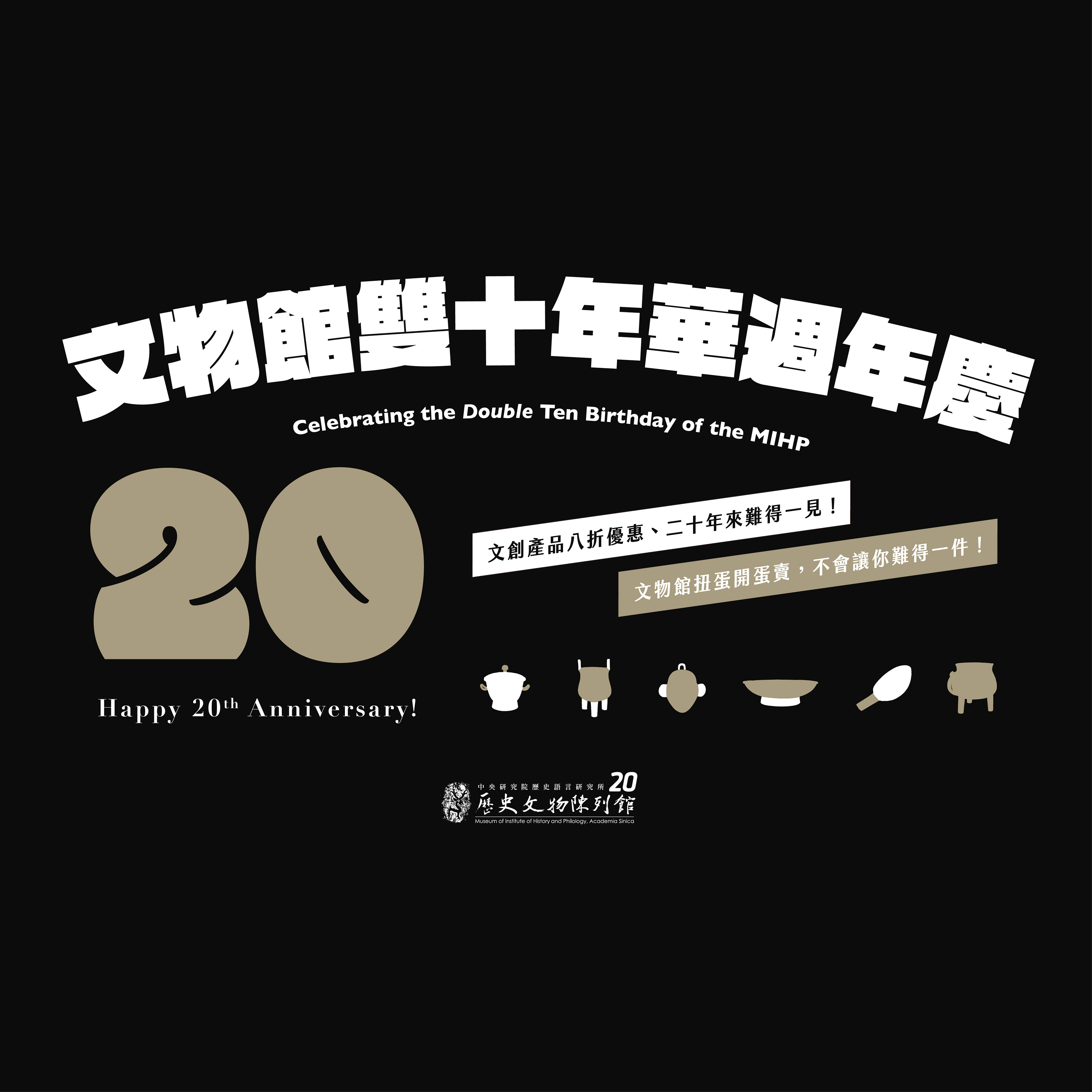 海報除主要的「20」數字凸顯重新開館二十週年,也利用「商王洗澡要洗熱水」立體磁鐵(文物館扭蛋第三彈)中所使用的文物圖像剪影作為視覺輔助,作為文創品中今年推出的新品項,代表出鏡以宣傳歷史文物陳列館重新開館二十週年館慶系列活動的文創品特賣優惠活動-文物館雙十年華周年慶。
